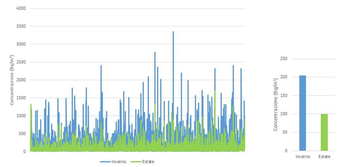 Figura 1 - Variazioni annuali delle concentrazioni di radon indoor in estate e inverno: a sinistra tutte le 4500 misure, a destra concentrazione media stagionale