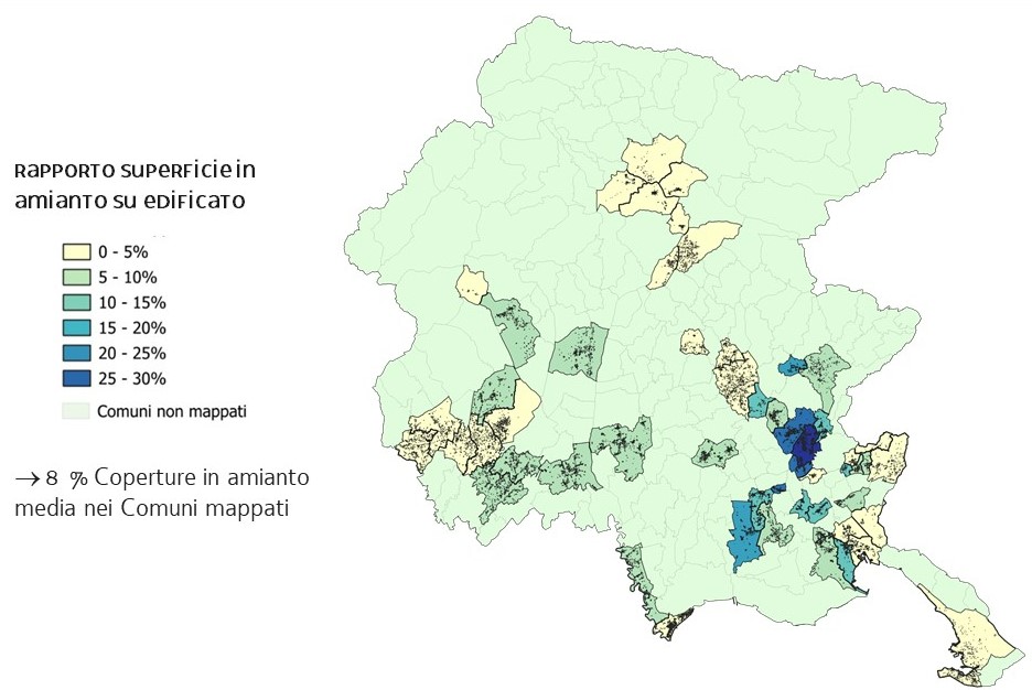 Al fine di stimare la possibile superficie di amianto presente su tutto il territorio regionale, è stato calcolato il rapporto medio, risultato pari all'8%.