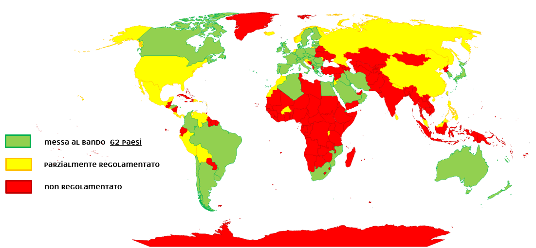 A livello mondiale, solo 62 Paesi (tra cui tutti quelli appartenenti all'Unione Europea) hanno messo al bando l’amianto. In altri Paesi l’amianto continua ad essere estratto, lavorato ed utilizzato (costruzioni, auto motive, ripari nei paesi più poveri).