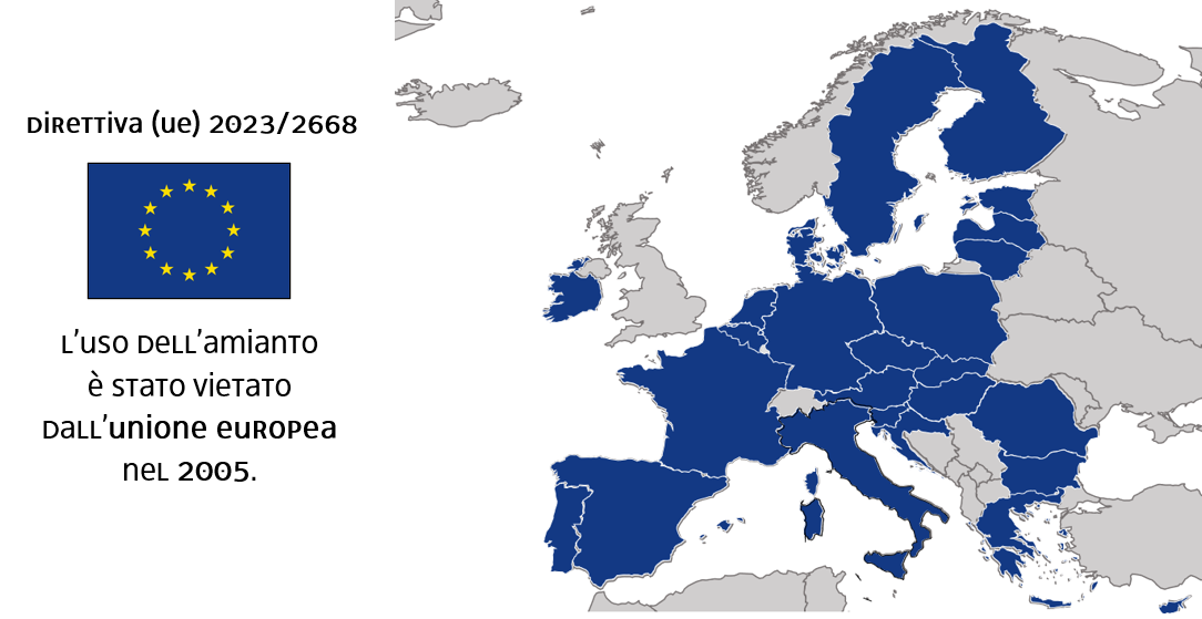 Nel 2005 l'Unione Europea ha vietato l'uso dell'amianto in Europa. Con la Direttiva UE/2023/2668 ha adottato nuove misure per rafforzare la protezione dei lavoratori, fra cui: riduzione fino a 10 volte dell’esposizione all’amianto per i lavoratori UE; tecnologie più moderne ed efficaci per rilevare le fibre di amianto; nuovi requisiti sui dispositivi di protezione individuale; incentivi per la rimozione dei materiali.