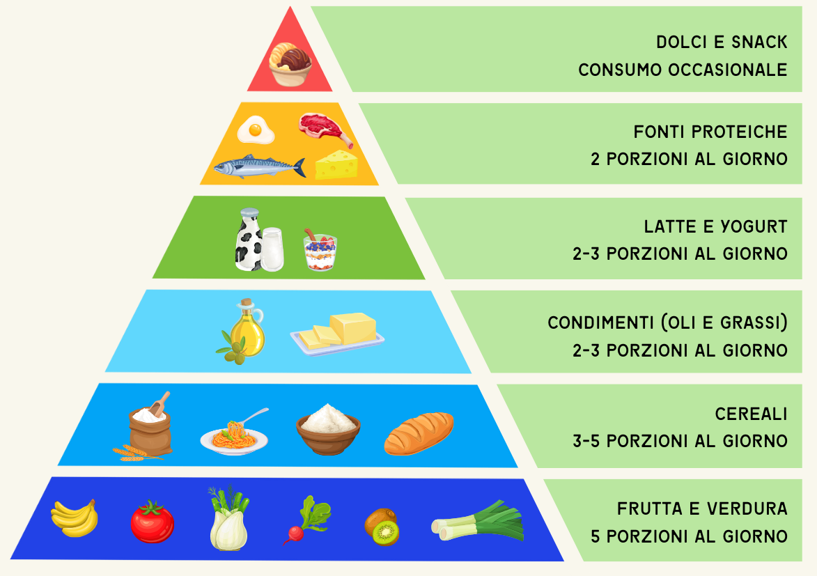 La piramide alimentare mostra graficamente il modello di alimentazione ideale (suggerito anche dall'Istituto Superiore di Sanità), mostrando quali cibi vanno consumati e con quale frequenza. Nella fascia inferiore si trovano gli alimenti da mangiare più spesso, più volte al giorno: sono la base di una corretta alimentazione. Man mano che si sale verso il vertice della piramide, invece, si trovano i cibi da consumare meno spesso.