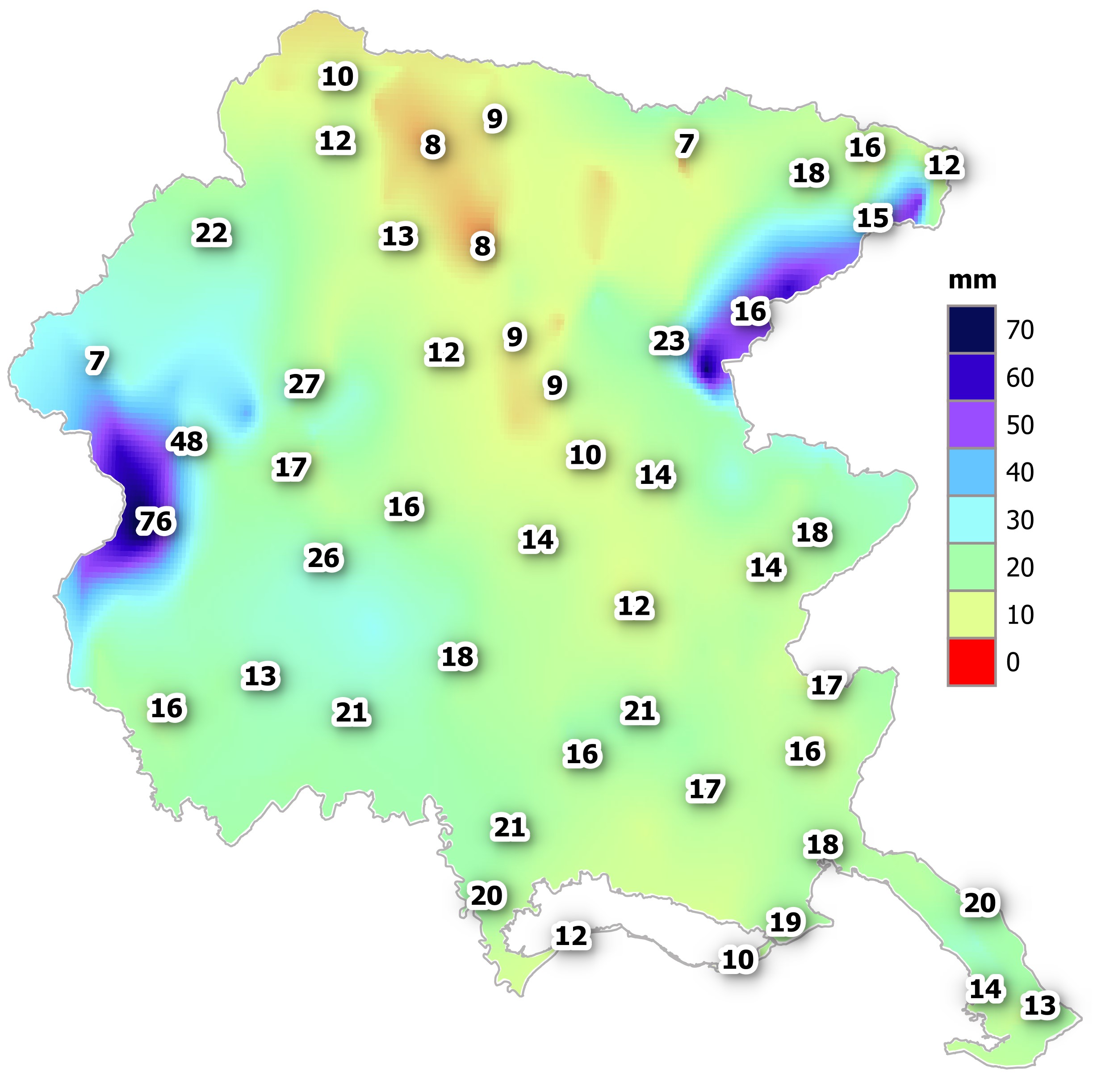 - il numero di giorni di pioggia su tutto il territorio regionale risulta compreso tra 2 e massimo 9 di Piancavallo, valori compresi fra il 10° e il 25° percentile rispetto alla climatologia degli ultimi 30 anni.